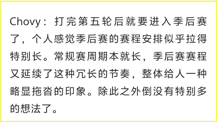 在接受赛后采访的时候,大超当众吐槽:常规赛周期本身就很长,季后赛赛程,又延续了这种冗长的节奏,整体给人一种拖沓的感觉,这话说的真没毛病,LCK每周打完都要休息几天,如果赛程安排紧凑一些的话,现在应该都已经在打季后赛了,不过LCK也就8支队伍,官方也没啥办法。