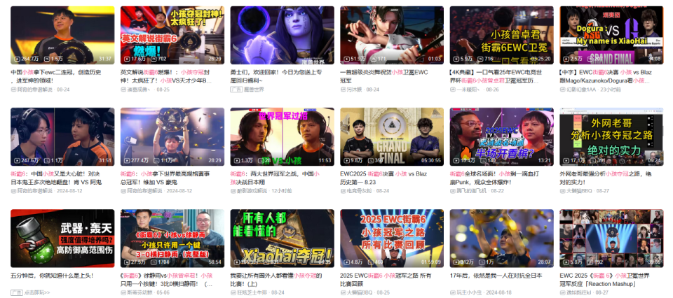 随小孩夺冠一同而来的,还有《街霸6》的泼天流量。B站数据显示,近一个礼拜,多则与小孩夺冠相关的视频播放量在百万以上,连带小孩所使用角色不知火舞的视频播放量也一路水涨船高。