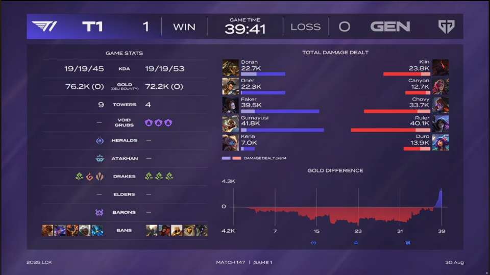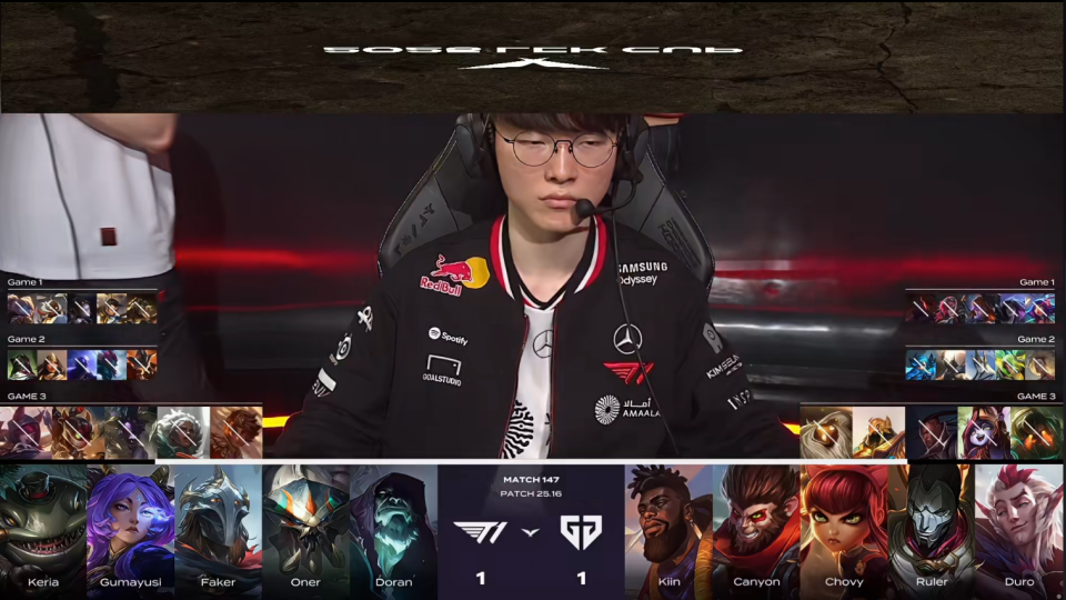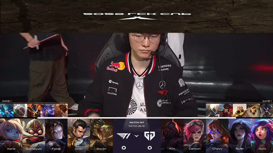 第一局比赛,T1蓝色方,禁用:岩雀、芸阿娜、兰博、安蓓萨、格温,选用:Doran鳄鱼、Oner赵信、Faker发条、Gumayusi飞机、Keria波比;GEN红色方,禁用:潘森、猴子、沙皇、巴德、牛头,选用:Kiin塞恩、Canyon蔚、Chovy阿萝拉、Ruler卡莎、Duro妮蔻