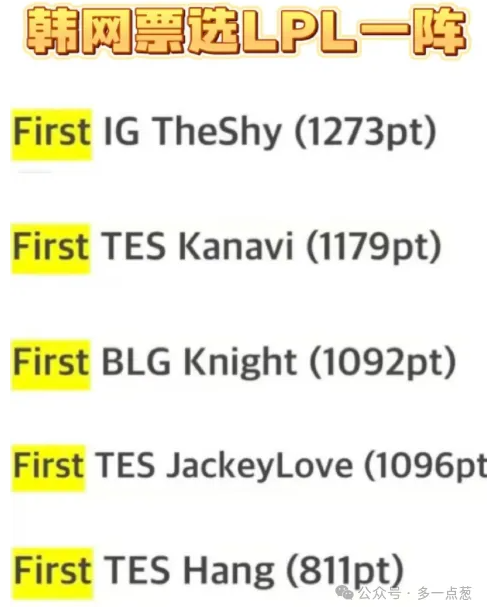 当然,这也只是韩网票选的最佳阵容,这个最佳阵容肯定会和官方最后票选的最佳阵容有点出入,不过感觉应该是大差不差的。除了Scout能够上榜,其他人能够入选,基本没啥大毛病。这一点也是很多粉丝比较认可的,在后面官方出的最佳阵容中应该是没有Scout。