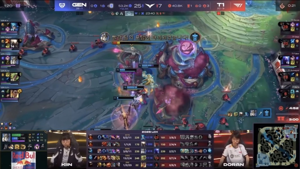 整场看下来,T1的状态是有点低迷的,除了老李和Oner之外,剩下的三兄弟,一个比一个抽象,第一把多兰打得还算亮眼,得到打野的帮助后,对线打出了优势,但下路直接被爆了,小吕布1-4,K博士0-3开局,老李不死发条燃尽,才把比赛赢了下来,结果后面两局,上下路集体开送了。