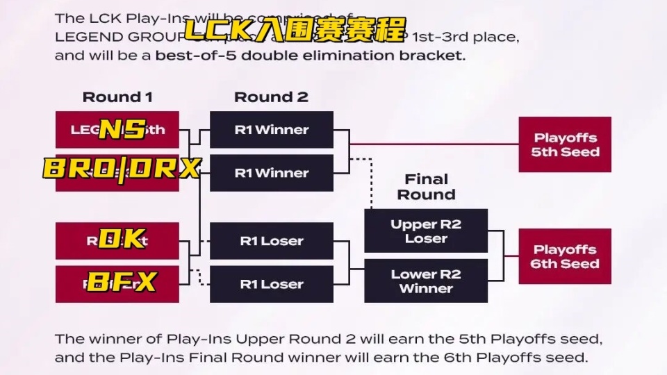 T1季后赛可选的对手,目前有NS、DK、BFX,还有一支入围赛队伍,名额暂时没有确定,DRX和BRO的收官战,谁赢谁进入围赛,LCK入围赛的赛程,也已经出炉了,涅槃组的DK和BFX,争夺一个季后赛名额,传奇组的NS打DRX或者BRO,这四队,DK和NS进季后赛的可能性比较大。