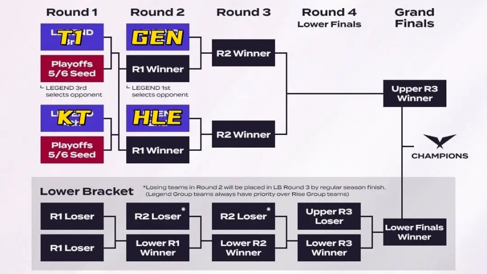 传奇组排名确定之后,季后赛的分区也已经出炉了,和LPL的14、23分区不一样,LCK用的是13、24同半区,也就是说T1季后赛,是跟GEN是同区的,如果第一轮赢了的话,最快第二轮T1就要再战GEN,虽然最近状态有点差,但季后赛T1只要不选DK,剩下的队伍,肯定都是好打的。
