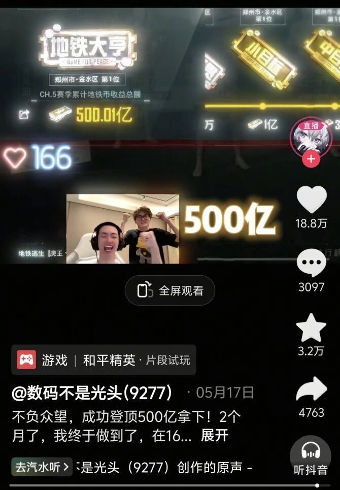 另一方面,则是主播孵化。《和平精英》官方深度培育了一批在“地铁逃生”模式中成长起来的代表主播:比如上述提到的主播“数码”,不仅在赛场表现亮眼,更是长期凭借冲击榜单、积累稀有物资与资产,在模式内的总资产早已突破500亿,因而被不少玩家称为“地铁首富”。而“帅宇”则因“地铁扶贫”出圈,他会在游戏中扫号帮助“破产”的粉丝,帮助其快速积累财富。这些主播不仅活跃在赛事舞台上,更在内容层面持续输出,将地铁玩法的讨论度推向更高热度。