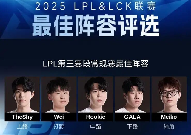 随着LPL骑士之路结束,LPL也是迎来了短暂的休赛期,在休赛环节当中,很多LPL观众都在讨论,常规赛的最佳阵容名单。而某个电竞论坛在近期发布了一个投票活动,专门邀请电竞观众来票选自己心目当中的最佳阵容,最终IG上单选手TheShy、打野选手WEI、中单选手ROOKIE以及下路双人组GALA和MEIKO,全员入选第三赛段的最佳阵容名单。