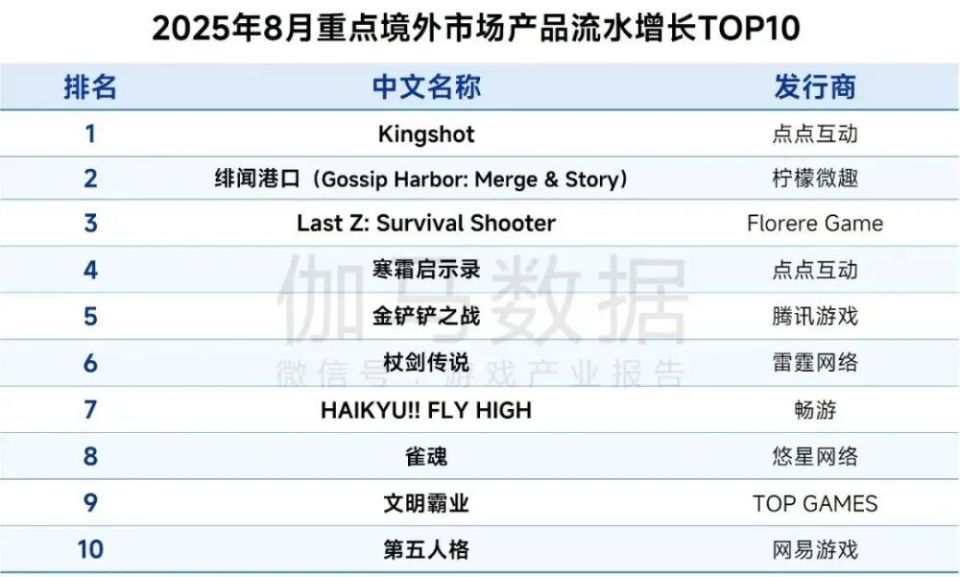 8月新游流水测算榜单共有两款射击类产品入围,在竞争激烈的射击游戏赛道,这两款新品也代表了两种不同的发展路径。由腾讯光子工作室群与拳头游戏联合开发的《无畏契约:源能行动》(《无畏契约》手游)于8月19日正式在国内开启公测,上线后展现出强大的“吸金”能力,仅十三天就以超3亿元的预估流水稳居榜首。作为端游爆款《无畏契约》的正统手游,这款产品的成功在预期之内,验证了顶级IP与成熟玩法结合的巨大市场号召力,其表现也大幅领先于同期其他新游。另一边,沐瞳推出的《发条总动员》,则试图在小众赛道走出差异化路线。该作主打飞行弹幕射击玩法,结合复古橡皮管画风,加之上线初就与《猫和老鼠》联动,进一步强化了独特的美术风格带来的优势,拿到了不错的短期爆发性成绩。目前看来,这款产品凭借玩法与美术风格的组合,展现了极强的风格化特质,有望在STG这一细分领域占据领先地位。值得一提的是在iOS下载测算榜内,射击品类占比达40%,显示出当下射击品类的强大活力。《无畏契约:源能行动》再次位列榜首,《我的花园世界》《发条总动员》两款新品也跻身榜单。回到新游流水榜单,排名第二的《我的花园世界》是一款女性向古风模拟经营手游,游戏核心玩法聚焦于“种花、插花、卖花”的轻度内容循环,并以种植经营为基础融入了家园装扮系统。然而,在看似休闲治愈的外表下,游戏搭建了一套颇为重度的商业化模型,设置了包含广告、免广告特权、多种月卡与VIP等级在内的丰富付费点。此外,“种花得真花”抽选送实体花束的营销活动,有效提升了用户的付费意愿与游戏活跃度。这款游戏用低门槛内容吸引广泛用户,再通过深度付费挖掘核心玩家的消费潜力的一套打法最终在数据反馈上也相当成功,多次登顶iOS免费榜,最高到达畅销榜13位。位列第三的《灵兽大冒险》是网易推出的一款竖屏回合制捉宠MMO。网易做MMO向来得心应手,《灵兽大冒险》也一如既往吸取了网易《梦幻西游》等经典产品的成功经验,保留传统MMO社交深度与策略复杂性的同时,利用竖屏设计完美契合了移动端的碎片化使用习惯。位列第五的《诛仙2》是完美世界今年在国内上线的首款重点新游。该作于2019年正式立项,2021年首次曝光,原计划2023年上线。然而,面对市场环境的快速变化,项目组判断产品原有定位已与玩家新需求出现偏差。为确保品质与市场匹配,项目组决定投入额外两年时间对游戏进行深度优化与改造。《诛仙2》的开局表现可谓稳健,至于它能否在未来延续完美世界在国风仙侠MMORPG赛道的传统优势,仍有待市场的长期观察与检验。点点双强跻身海外增长榜前五,《Kingshot》环比增逾20%在2025年8月的海外游戏流水增长榜中,点点互动依旧表现抢眼。其中,《Kingshot》当月流水环比增长超过20%,登顶榜首。与此同时,点点的旗舰产品《寒霜启示录》也仍然在“不知疲倦”地增长着,跻身TOP5。值得注意的是,《Kingshot》的国内版本《奔奔王国》目前已上线微信小游戏与APP端,暂处于前期测试与素材调试阶段,未大规模投入买量投放,该产品的市场潜力远未完全释放,其未来数据表现值得持续密切关注。柠檬微趣旗下旗舰消除游戏《绯闻港口》于7月下旬启动三周年庆典,当月底推出为期31天的限定活动“Triennial Triumph”,有效拉动玩家活跃与付费意愿,推动游戏单日流水突破历史峰值。人气动画《排球少年!!》改编的手游《排球少年:新的征程》国际版《HAIKYU!! FLY HIGH》于7月末正式上线,迅速登顶美国、加拿大、法国、德国、泰国等多国App Store游戏免费榜。受强势上线表现带动,该游戏在8月实现流水环比翻倍增长。2025年8月,伽马数据移动游戏流水测算榜TOP10产品整体排名波动较小,变动幅度均未超过5个位次。在本月榜单中,《英雄联盟手游》与《金铲铲之战》成为排名上升最为显著的产品。《英雄联盟手游》凭借“水晶玫瑰”系列新皮肤的推出,连续四日进入中国iOS游戏畅销榜前三,推动当月流水环比增长约40%。《金铲铲之战》则于月初上线“天下无双格斗大会”新赛季,推出“香水宝石”主题角色与皮肤,并在月中启动四周年庆典活动,多重内容更新有效拉动了用户活跃与付费意愿,助力流水持续增长。最后,纵观8月游戏市场,伽马数据报告显示,中国国内游戏市场收入为292.63亿元,环比增长0.61%,同比去年8月下降13.01%。市场增长乏力的核心原因在于缺乏现象级新作的驱动,去年同期在《黑神话:悟空》推动下形成的高基数,放大了本期的同比落差。当前市场处于“新老产品换挡”的过渡阶段,增长动能有所减弱。客户端游戏市场收入为65.63亿元,环比下降1.11%,同比增长17.59%;移动游戏市场收入达215.41亿元,环比增长0.85%,同比下降4.25%。中国自主研发游戏海外市场实际销售收入为16.8亿美元,环比下降0.79%,同比下降10.66%。由于上月大量头部产品集中推出运营活动,带来高基数效应,本月收入出现回落。
