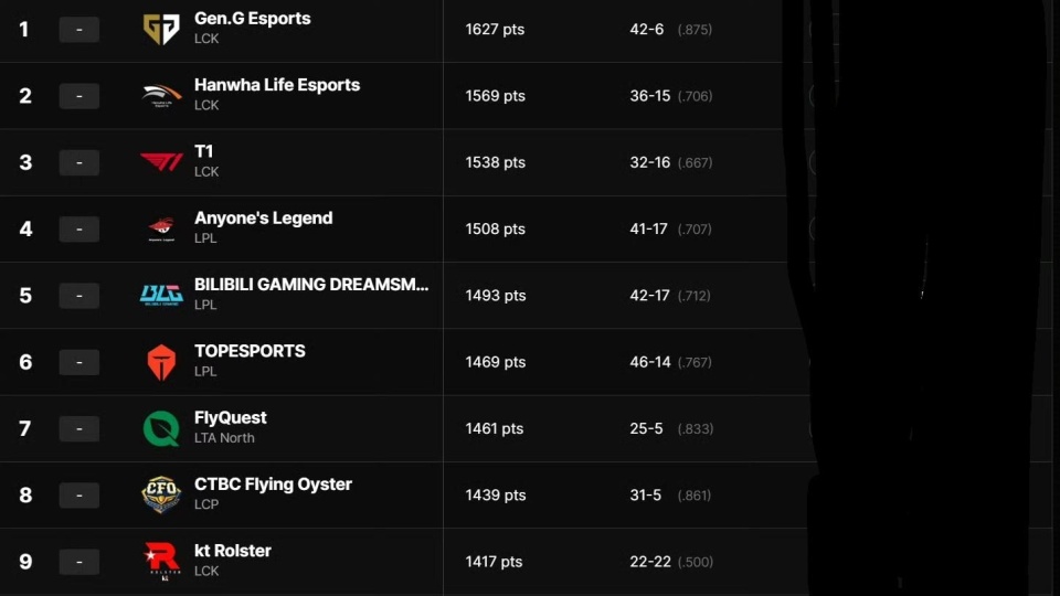 拳头官方在近日,更新了全球队伍战力榜单,LCK的GEN、HLE、T1包揽前三,LPL的AL、BLG、TES分别位列4-6名,剩下的7-10名,分别是FLY、CFO、KT、G2,咱赛区的四号种子IG,连前10都没挤进去,不过这个榜单,看一乐就行了,因为拳头是按胜场、败场数自动计算的。