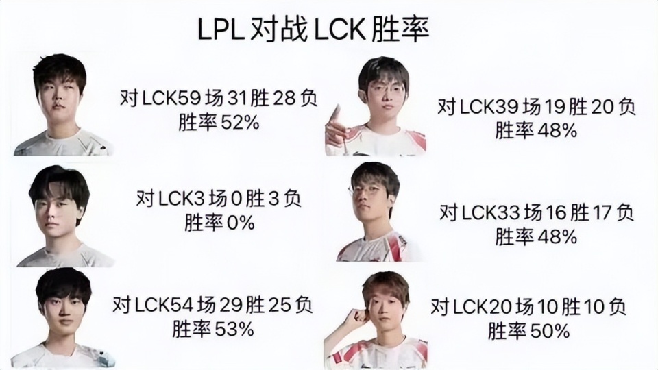 LPL今年夺冠的最大阻碍,依旧是LCK赛区,有网友在近日,统计了LPL四支世界赛队伍,所有参赛选手职业生涯,对战LCK队伍的胜率,左手以29胜25负的战绩登顶,总胜率53%,排在Knight后面的,是Bin哥和旮旯,他俩的抗韩胜率,都有52%,剩下的选手,大多都在40%-50%之间。