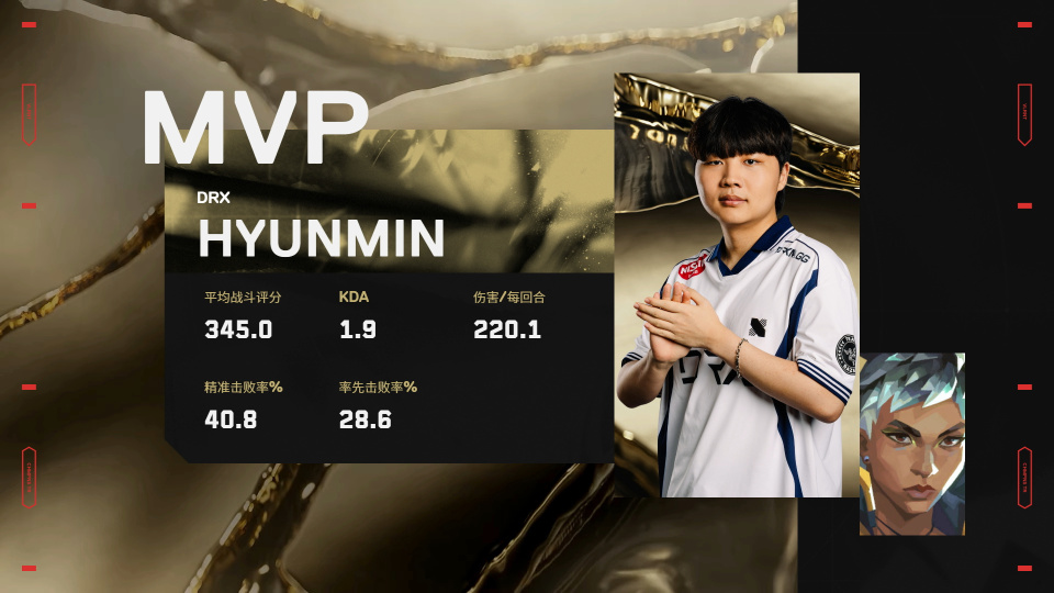 到比赛结束时,HYUNMIN的个人影响力甚至超过了Jinggg。这位韩国决斗者取得了令人难以置信的36/19/1 KDA、220的ADR和八次首杀,而Jinggg的数据是28/19/5 KDA、175的ADR和七次首杀。