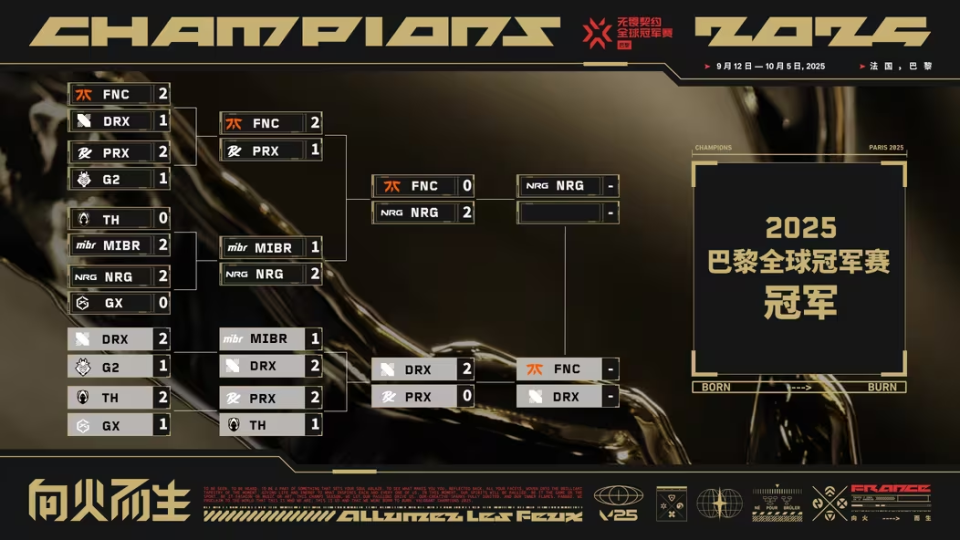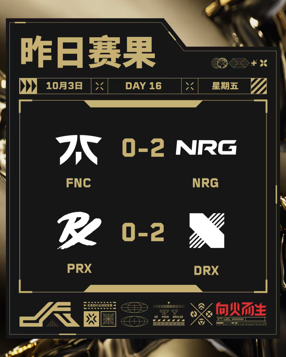 无畏契约巴黎全球冠军赛淘汰赛第六日的比赛已经结束!NRG战胜FNC挺进总决赛!PRX不敌DRX遗憾离场。