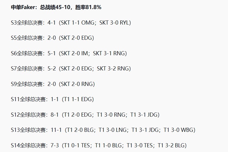 最后要重点说的就是Faker选手,在队内其他选手来之前,Faker就是冠军了,而且对阵LPL赛区的胜率一直都非常高,到目前为止Faker选手已经和LPL赛区交手55场,赢下了其中的45场,一个极其恐怖的数据。