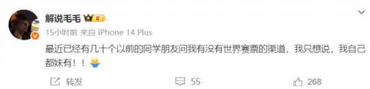 最后,就是解说方面,毛毛近日也发文表示,连他自己的票都没抢到,更不用说有其他渠道可以去现场看比赛了。
