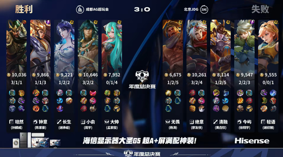 王终见王,再无锋芒,两个王在赛场上的实力还是差距明显,AG3-0战胜JDG,年总拿到四连胜。清融首次交手坦然,赛后也表示非常羡慕。