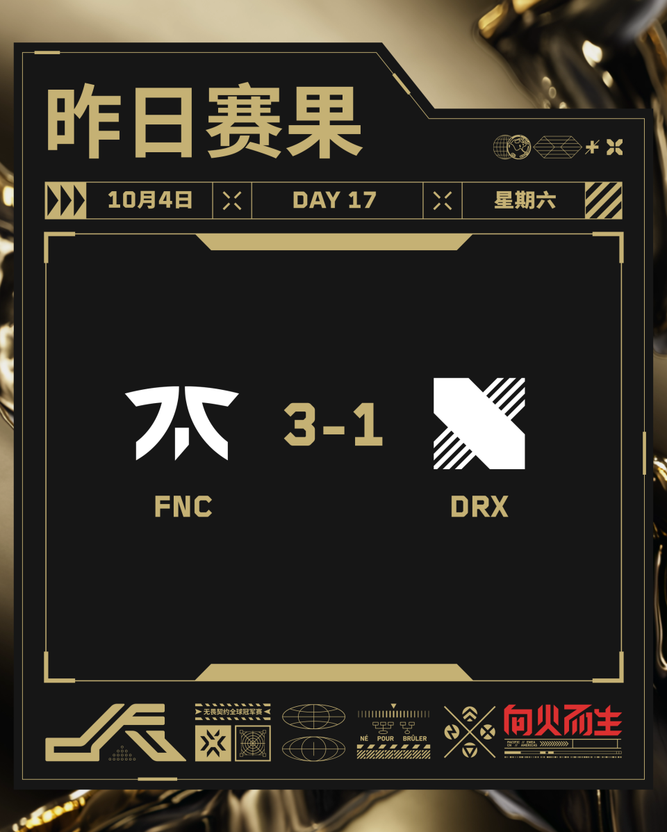 无畏契约巴黎全球冠军赛淘汰赛败者组决赛已经结束!恭喜FNC战胜DRX成功与NRG会师总决赛!