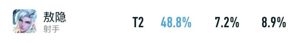 可能是因为翻盘频率太高了,才让敖隐的巅峰赛胜率仅剩48.8%,要不是他保信誉分还行,BP率超过15%,再加上国服分也比较高,我都想把敖隐排在T2了。