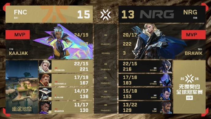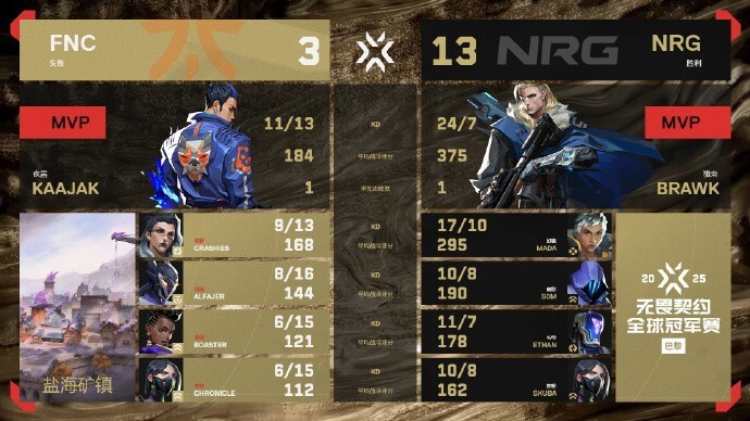 北京时间10月5日,2025年无畏契约巴黎全球冠军赛总决赛,NRG以总比分3-2击败FNC,拒绝让二追三夺得冠军!