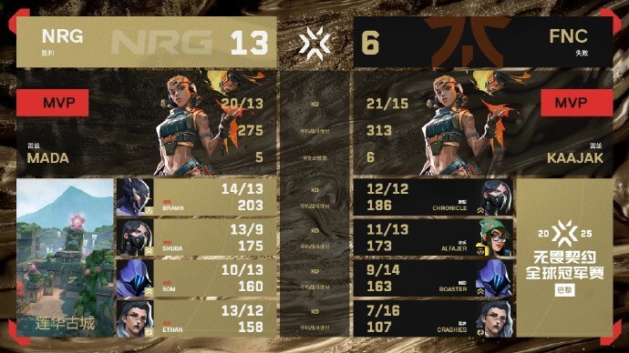 NRG手握地图BP优势,禁用2张图的同时选择盐海矿镇作为图一,在本届冠军赛全胜的他们马上进入状态,全面压制FNC,1-0先发制人;来到FNC选图莲华古城,NRG在进攻方延续手感,多点开花,一度8-1领先并将优势保持到最后,2-0把FNC逼入绝境。