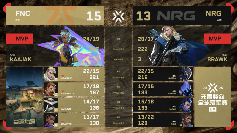 无畏契约2025全球冠军赛已经到了最后的收尾战,在刚刚过去的一天,FNC在败者组决赛,以让1追3击败了太平洋赛区的DRX,成功晋级最后的决赛,而决赛的最后,正是此前将他们打进败者组的NRG。