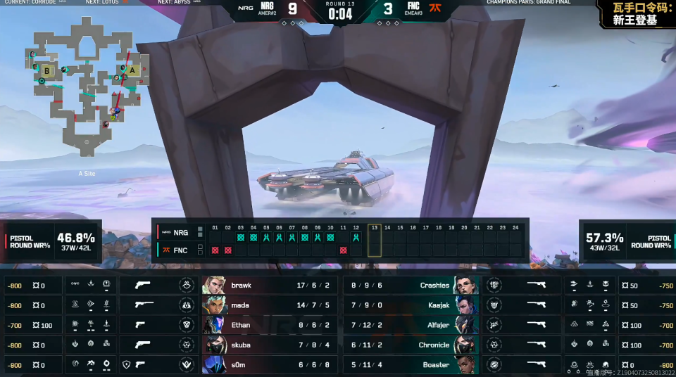上半场brawk化身奥丁仙人,不断的穿射带队连拿三分。第4回合FNC在A大直接齐拉,将NRG按在A大翻盘。第9回合FNC守B放C,拿到人数优势后,被skuba顶住BC旋转门,FNC人数被逐个摘点。第10回合FNC的混起局在C点打出高效火力。上半场NRG与图一一样,进攻打出统治的表现,brawk与skuba两人都有着超强的发挥表现,上半场NRG 9-3 FNC。