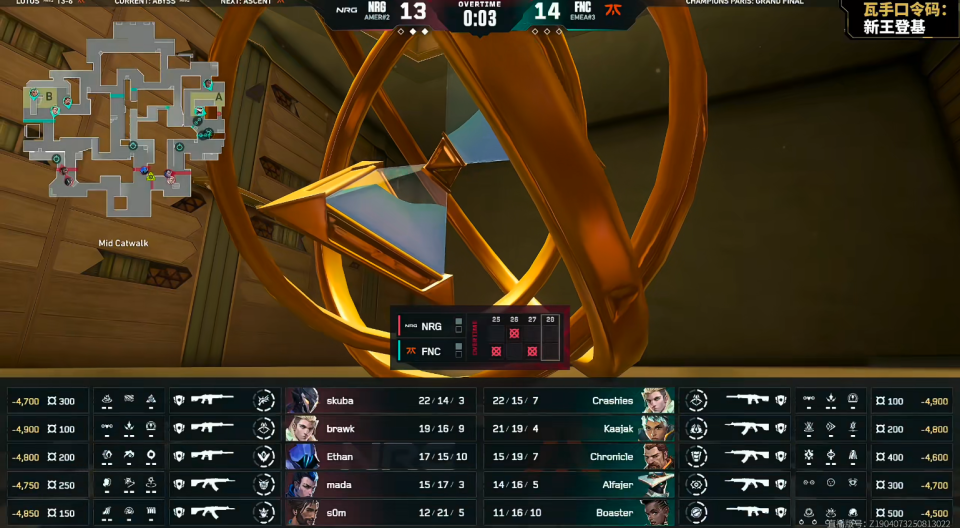 加时赛首轮FNC进攻控下中路夹击B点,NRG回防被FNC道具覆盖包点赢下。换边之后FNC回防A没能对枪打过。