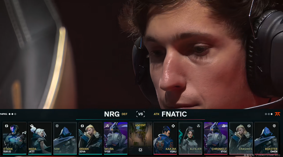 上半场FNC赢下手枪分,第3回合mada抓到FNC背身的timing,并与brawk两人守住了FNC的进攻。第4回合brawk奥丁守中,Ethan在B包点连打四个,将FNC的长枪分打掉。第8回合s0m混烟出打掉alfajer,FNC继续往A摸进但没有搜点,skuba连打三个打出完美团灭。第19回合FNC打B下包,残局二打一FNC人数优势,但skuba不断的骗拆成打掉一个强拆赢下。第11回合FNC终于打B赢下第3分。上半场NRG打出8连胜统治上半场,而FNC用出两个暂停只拿到1分,上半场NRG 9-3 FNC。