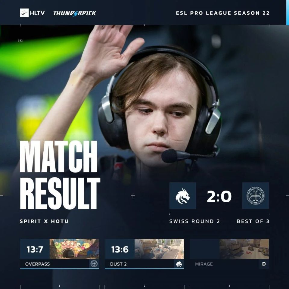 首图Overpass作为防守方的Spirit开局陷入落后,但zweih多次个人实力爆发配合队友助力Spirit取得优势,donk觉醒4杀取得9-3的半场领先。下半场Spirit稳扎稳打先取图一。进入图二Dust2,Spirit在donk的突破下打出前期领先,下半场更是神奇的残局偷包提前比赛进程,sh1ro狙击秀翻对手拿下比赛;而这是HOTU自第一阶段以来首尝败绩。