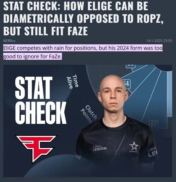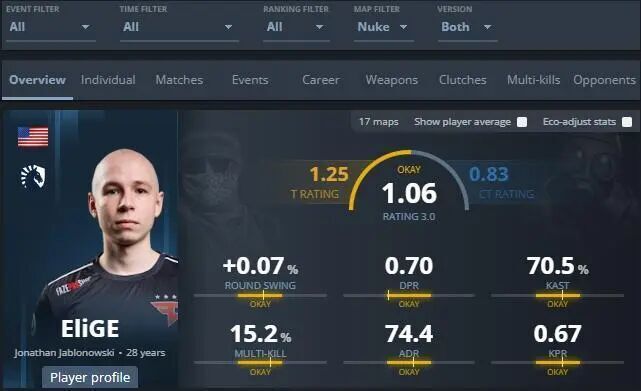 HLTV在阵容官宣后曾发文分析角色分配,指出换人理论上可行,但EliGE和rain必须在特定地图位置上互相让步。最终在Nuke和Inferno上,EliGE做出了妥协,让出了外场和A2楼的控制权,导致他在这两张地图的CT方Rating均低于0.95,远低于往常水准。