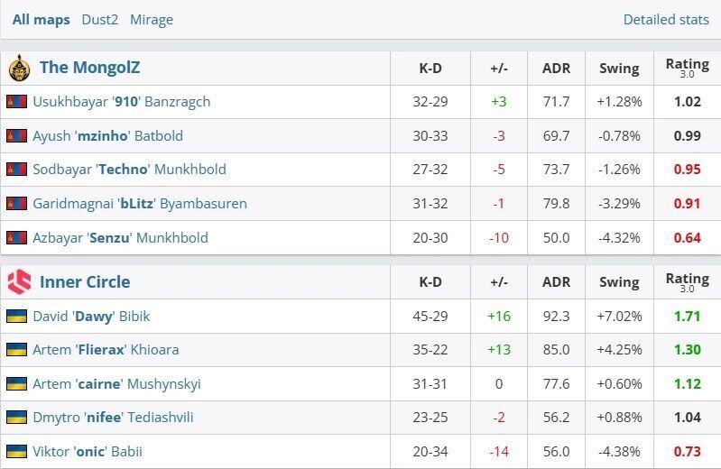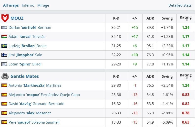 图一开局双方互不相让,但xertioN与Jimpphat拿下2打5的残局逆转战况,在上半场赢得8-4的优势,下半场更是一分不丢先下一城。图二MOUZ打出7-1梦幻开局,但随后GM连下8局险些掀翻对手,好在最后时刻MOUZ全员抗住压力,以极限的13-11拿下胜利。