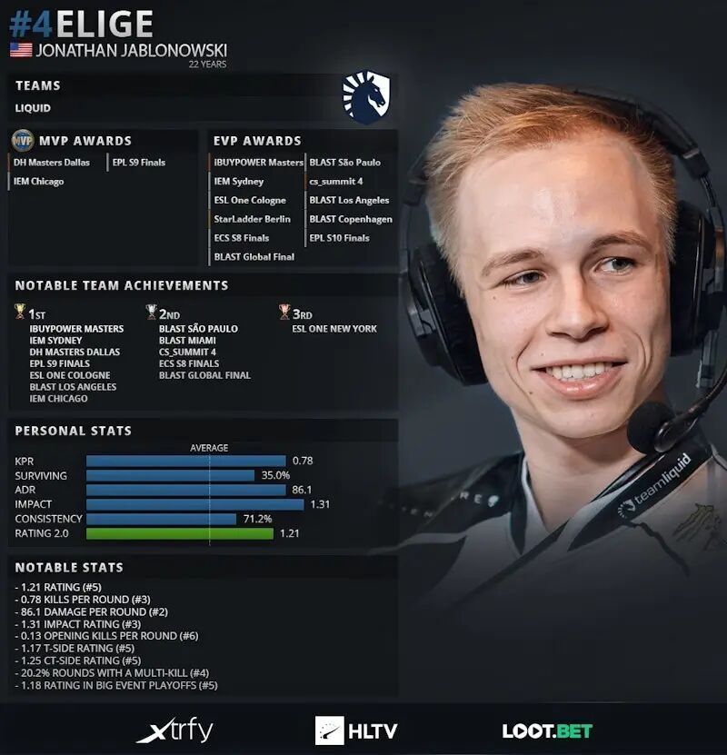 转机出现在2018年。NAF回归,stewie2K和Twistzz的加入让EliGE和Liquid一同登上巅峰。2019年成为他们的丰收年:ESL科隆、DreamHack大师赛达拉斯站、EPL S9、IEM悉尼、最速大满贯成就、BLAST洛杉矶、IEM芝加哥——冠军奖杯接踵而至,EliGE也以全年1.21rating荣获年度TOP4选手的殊荣。