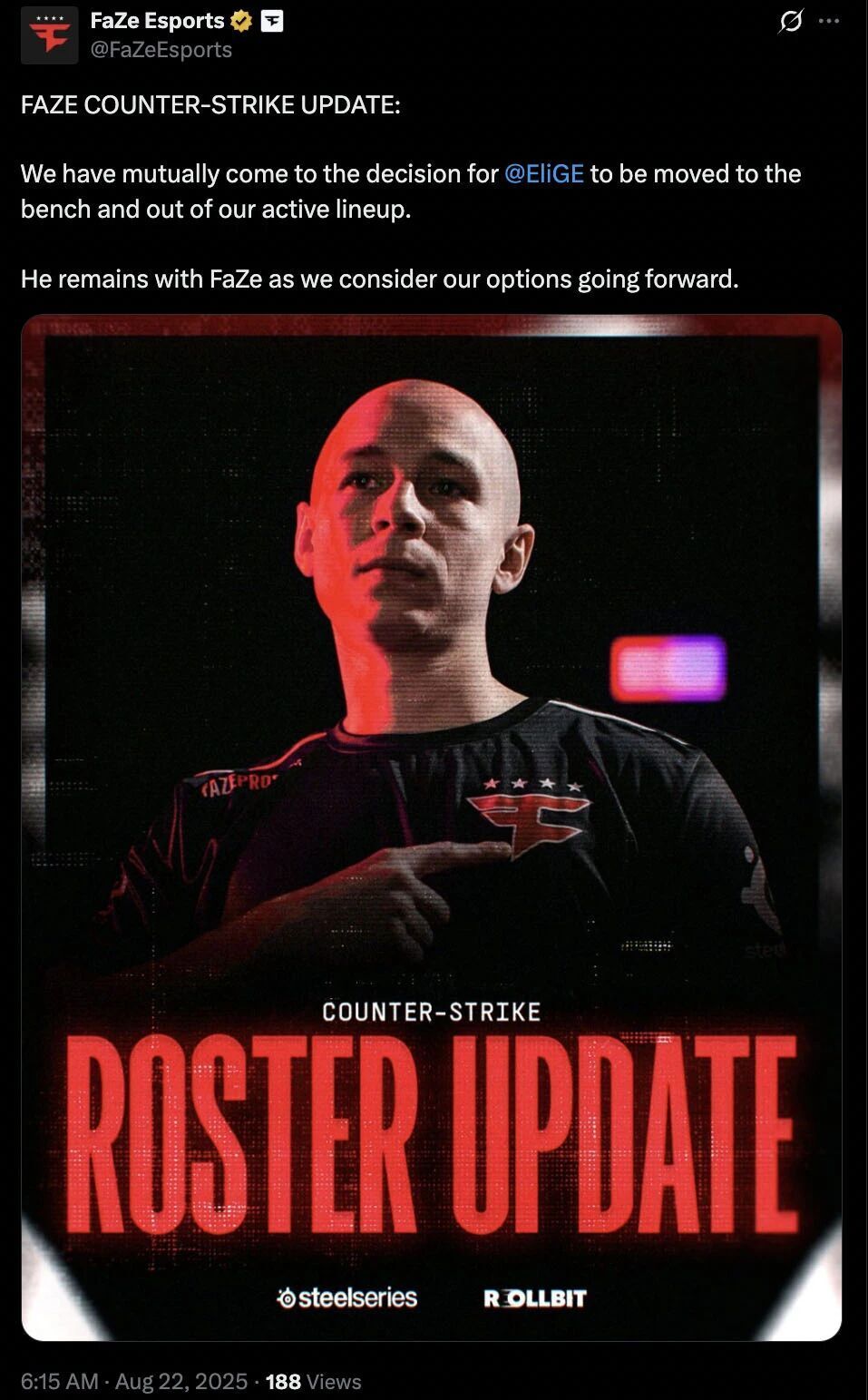 在离队后采访中EliGE透露,刚加入FaZe时与karrigan关于新体系的讨论曾让他对未来充满信心。然而仅一个月后,队伍便回归原有体系,让他感到相当挣扎。在理念不合、成绩不佳的情况下,分手成为双方最合适的选择。
