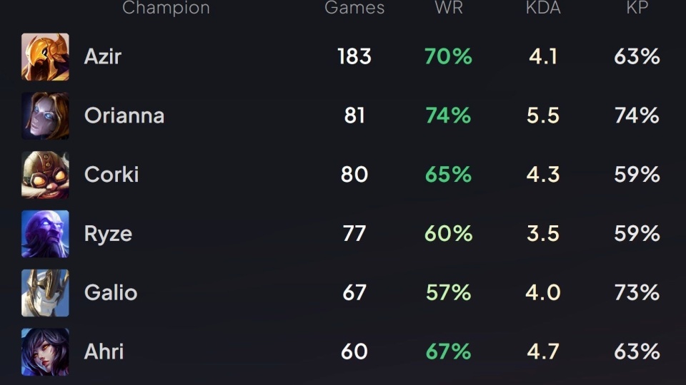 Faker登场次数超过30,并且胜率达到70%的英雄,一共有五个,最高的妖姬48场79%,其次是冰女39场77%,紧接着是发条,81场74%,最后是沙皇和维克托,这两个英雄胜率都是70%,但沙皇的场次多达183场,而维克托只有56场,剩下的英雄,除加里奥之外,胜率都在60%以上。