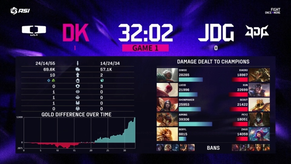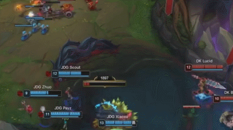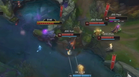 随后Xun接连出现失误,野区被抓阵亡,后入侵野区再次阵亡,连续阵亡之后JDG的局势崩盘,Lucid的盲僧则直接起飞导致局势逆转,本来没有存在感的ShowMaker妖姬也成功起飞拿下比赛。