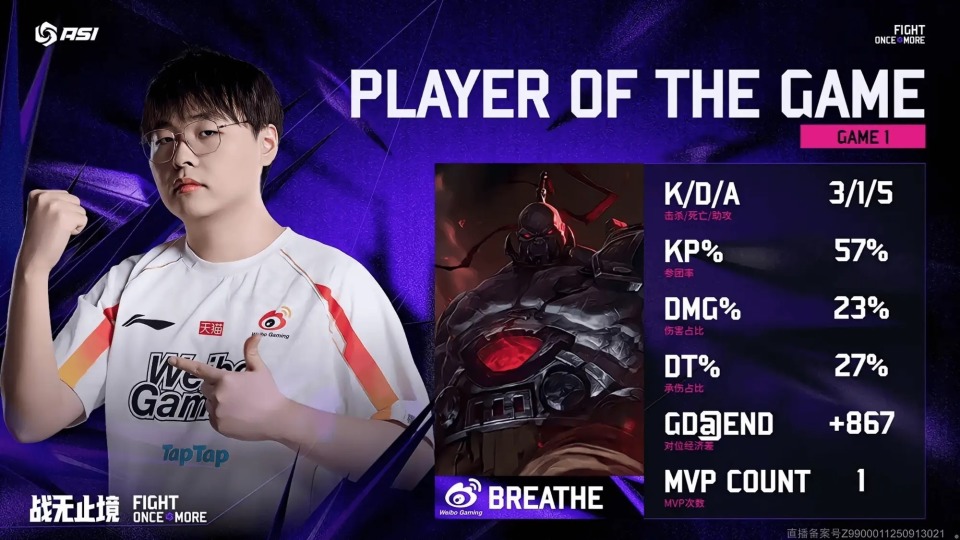 中期双方河道拉扯后,GAM辅助波比被击杀,WBG拿下听牌龙,GAM则是选择拿下厄塔汗。29分钟GAM飞机野区被轻松击杀,WBG拿下风龙魂。最终后期31分钟,GAM击杀light卢锡安,但是WBG其他人团灭GAM后,拿下第一局的胜利。首局MVP给到了breathe赛恩。
