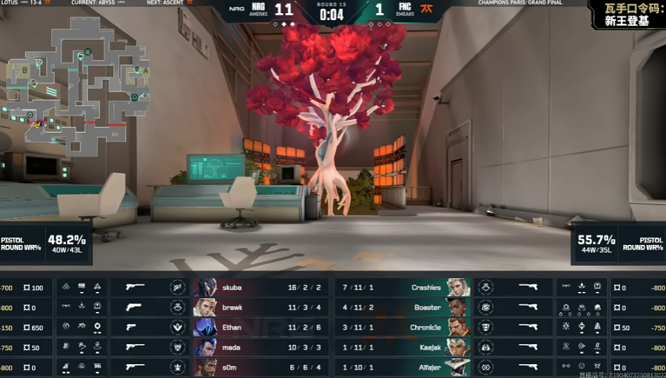 FNC在1-7落后的情况下输掉了一场5v3的黄金机会,NRG再次以9-3领先。下半场的手枪局对FNC至关重要,kaajak以四杀开局。Boaster通过1v2阻止了NRG的反经济局胜利,但FNC未能转换奖励局,NRG保持五回合领先。FNC的逆转未能真正实现,NRG以13-6赢得莲华古城,系列赛2-0领先。FNC需要让二追三才能夺得冠军奖杯。