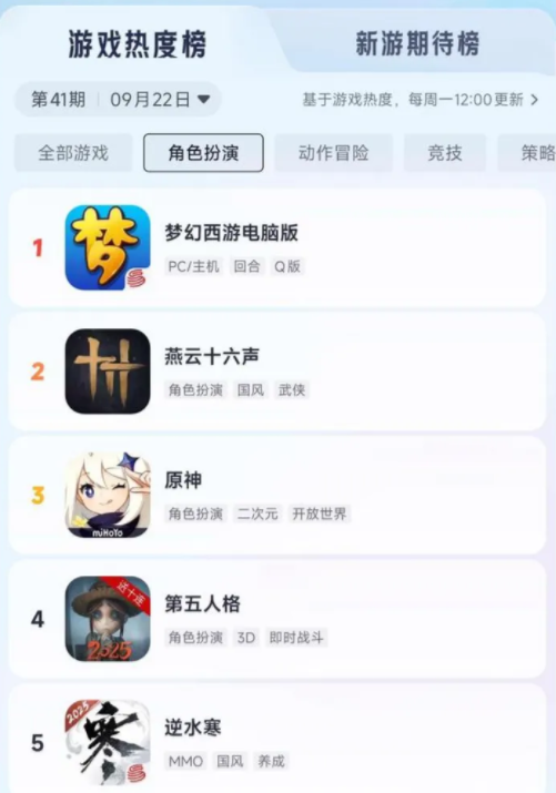 要知道,它的榜单邻居是《王者荣耀》《使命召唤》《三角洲行动》这样的行业巨头,这样的成绩对于一款二十多年的回合制网游来说,简直是不可思议的突破,而在角色扮演类目中,《梦幻西游》更是连续三周稳居第一,力压《燕云十六声》《原神》等当前最具人气的新品和热门大作。