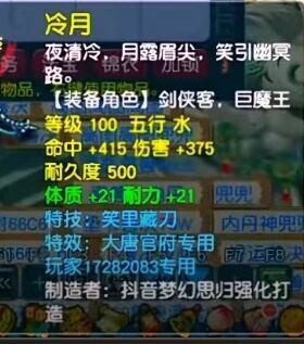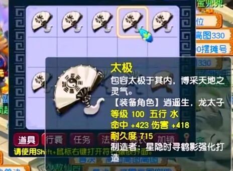 第四把是100级的扇子,伤害+325,耐磨双加+36,特技是笑里藏刀,特效是永不磨损。