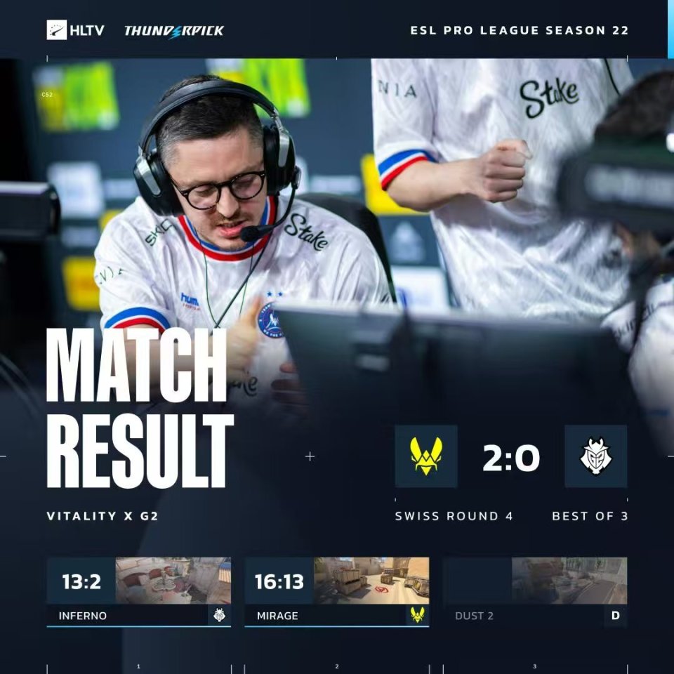 雷速体育10月8日讯 EPL S22小组赛第四轮,Vitality在图二2-9落后的情况下,顽强地将比赛拖入加时并成功翻盘,以2-0的比分战胜G2,晋级淘汰赛。