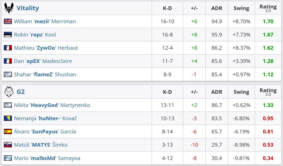数据方面,mezii状态不错,拿到了全场最高的1.70rt,ropz和ZywOo同样拿到1.67和1.62rt;G2这边则仅有HeavtGod一人状态在线。