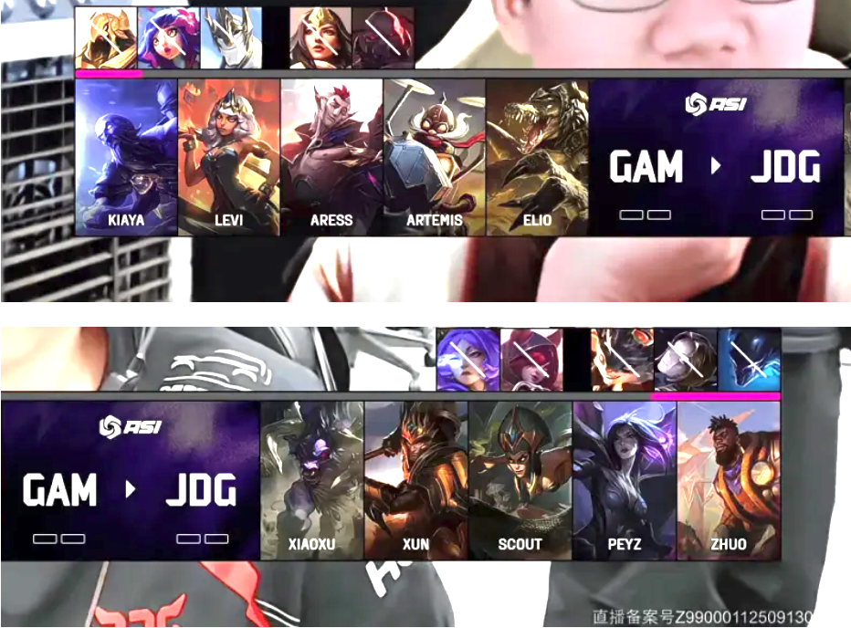 第一局比赛,GAM蓝色方,禁用:沙皇、妮蔻、加里奥、希维尔、塞恩,选用:Kiaya鳄鱼、Levi奇亚娜、Aress瑞兹、Artemis飞机、Elio洛;JDG红色方,禁用:梦魇、发条、兰博、霞、芸阿娜,选用:Xiaoxu奎桑提、Xun皇子、Scout蛇女、Peyz卡莎、Zhuo牛头