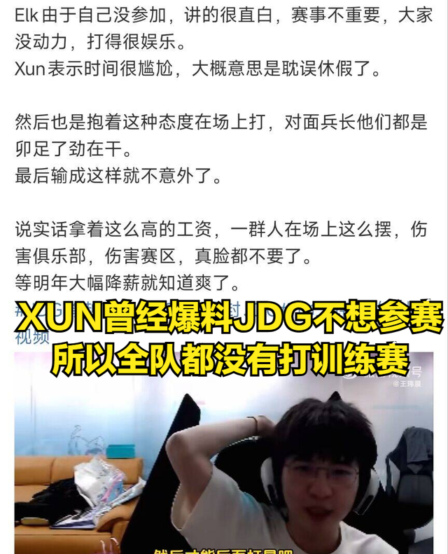 而JDG的比赛内容确实让很多观众感到生气,因为在这场BO3当中,JDG单纯在对线期间就被GAM所暴打,几乎每场比赛只能坚持前12分钟,等到第13分钟后,JDG就开始被GAM操作碾压。当然也有观众认为,JDG这是在摆烂故意输掉比赛,毕竟在比赛开始前,JDG打野XUN曾经公开跟ELK抱怨,表示这个比赛是官方强迫JDG选手参赛,JDG赢了没有好处,所以JDG全员都不想训练。