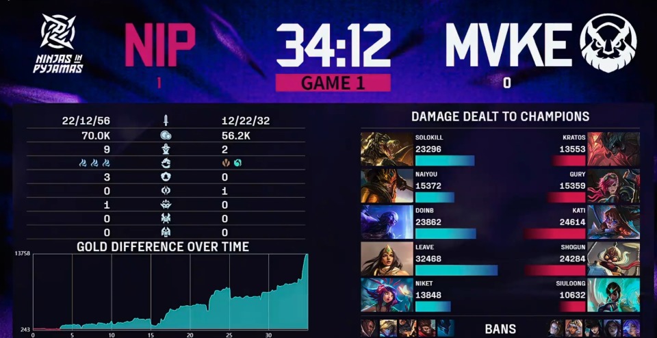中期MVKE中流露推进,Niket牛头被秒,NIP配合不佳被打出0换4,MVKE拿下厄塔汗。24分钟naiyou死歌下路再被抓死,MVKE拿下第一条大龙。最终携带大龙buff,MVKE轻松推掉NIP基地,追回一局。MVP给到打野Gury的婕拉。