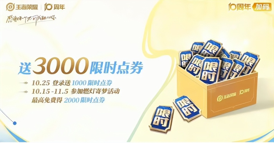 10月8日下午,策划突然爆料了10周年庆的全部福利。算下来,零氪玩家能免费拿到的奖励,价值已经超过5000点券。10月15日至11月15日,为期1个月的时间,会再次开启燃灯寄梦的活动,最高可以免费领2000限时点券。10月25日当天,只需要登录就能立即领1000限时点券。
