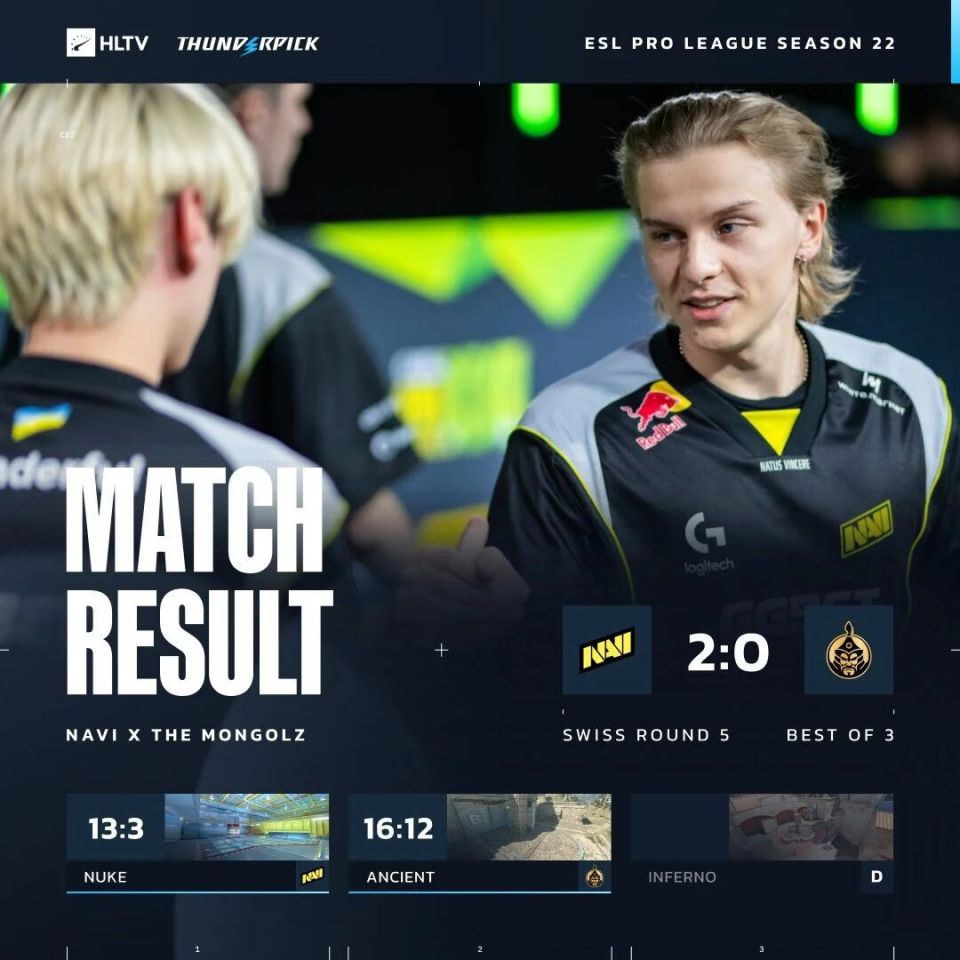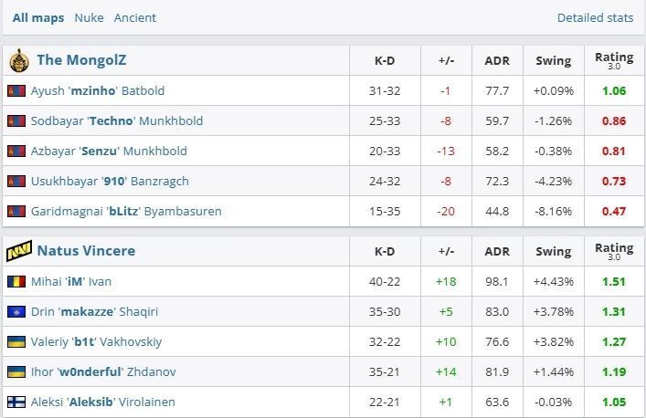 图一Nuke,NAVI在劣势进攻方杀穿蒙古防线,半场9-3占据绝对优势,换边更是防守连下4局光速拿下图一。图二Ancient两队在常规局杀得难解难分,上下半场均各取6分,蒙古队在拥有两个赛点情况下被NAVI追进加时。到了加时天生赢家强势连下4局完成翻盘,而蒙古队以2胜3负黯然出局。