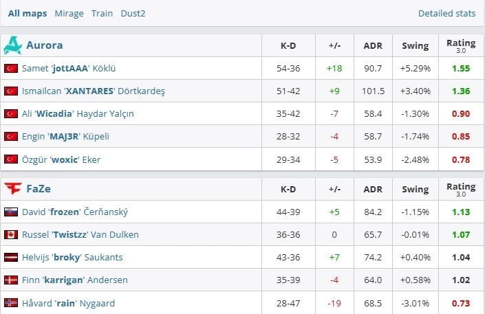 图一Mirage,上半场Aurora防守7-5领先两分,然而换边土耳其队进攻处处碰壁,仅拿到1分便溃败。图二Train,FaZe在防守2-0开局后被狠人领衔的Aurora打出一波13-0狂潮,土耳其队碾压式扳回一城。来到决胜图Dust2上,FaZe上半场进攻取得7-5,来到下半场却是火力全开,frozen屡屡现身多杀救场,最后更是以一个局部1V4收下比赛胜利,FaZe力战三图淘汰Aurora,获得最后一张淘汰赛门票。