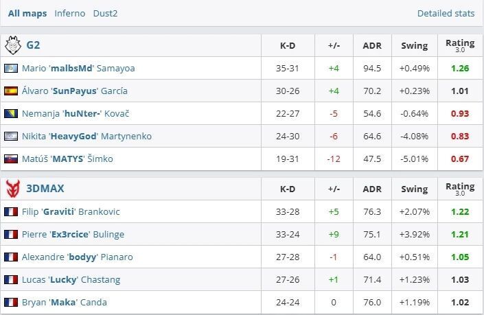 图一Inferno双方拉满24局,马尔布斯双拳难敌四手,3DMAX以两分优势惊险先下一城。图二Dust2上G2虽打出5-0完美开局,但随后迎接他们的是法国队的全员爆发,3DMAX从防守到进攻打出一波13-1狂潮终结比赛,G2以2胜3负遗憾倒在最后一轮。