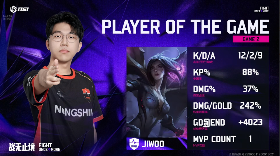 中期双方争夺厄塔汗,NS抢下厄塔汗,Calix发条单杀小虎瑞兹,NS打出0换5团灭WBG。23分钟双方争夺小龙,Tian盲僧被Jiwoo卡莎单杀,NS团战大胜直接一波拿下比赛的胜利。MVP给到Jiwoo卡莎。