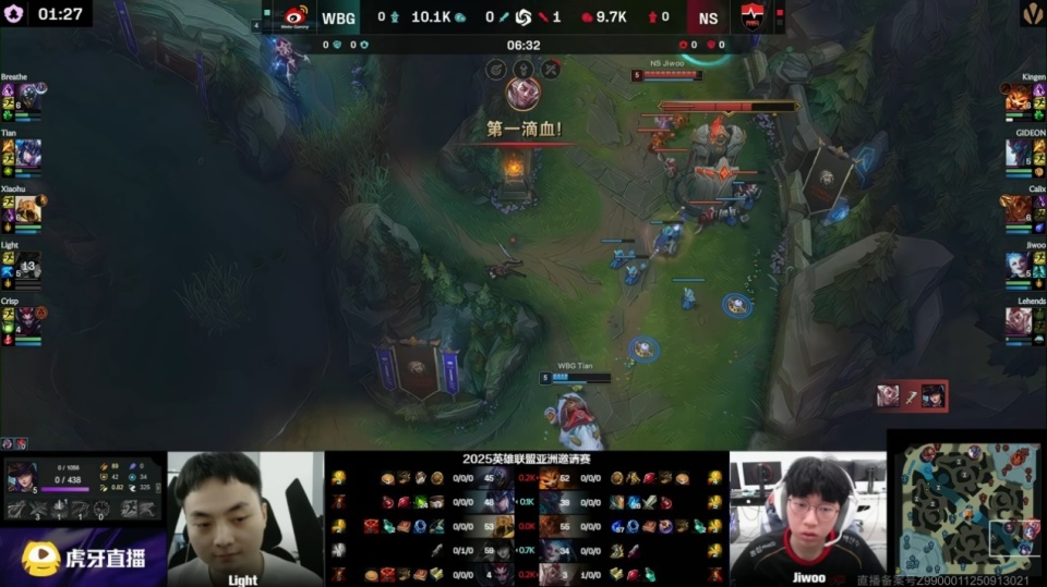 小虎一手加里奥立功,后续配合呼吸哥的上单狼母进场一波斩杀对方的核心下路芸阿娜,成功拿下首局比赛胜利,Jiwoo的表现也是遭到了观众们的无情吐槽,但进入第二局之后剧情马上就开始不对劲了,这次大家吐槽的是WBG的下路选手Light。