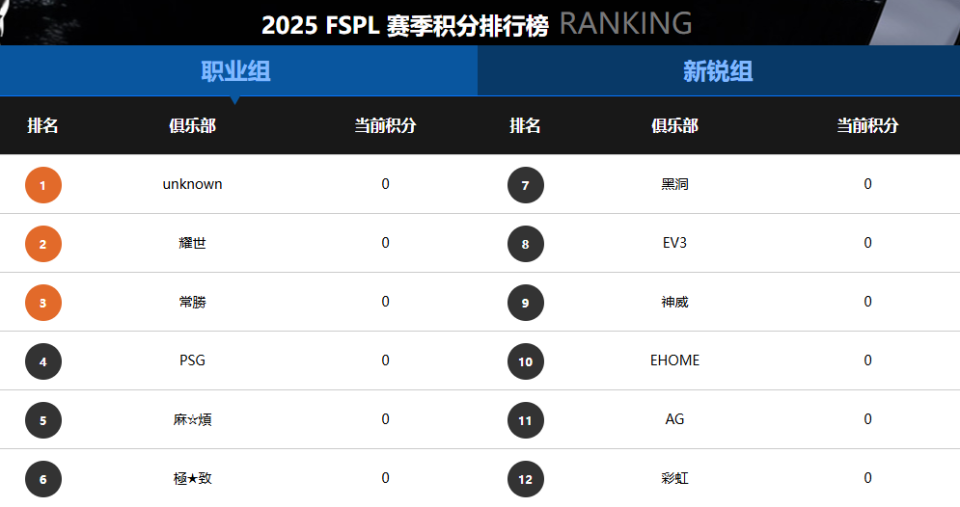 2025《街头篮球》FSPL职业联赛常规赛共有12支职业俱乐部参赛,除了UNKNOWN、耀世、PSG、麻☆煩、極★致、黑洞、神威、EHOME、AG以及彩虹10支老牌战队之外,还有新加盟的常勝以及EV3俱乐部,他们将进行8周的赛程争夺最终的常规赛冠军。