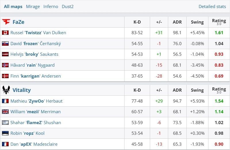除此之外,老生常谈的话题是Vitality队内的两位EPL高手,ZywOo已经在这项赛事中斩获三枚MVP荣誉,而ropz则是EPL四冠王选手。