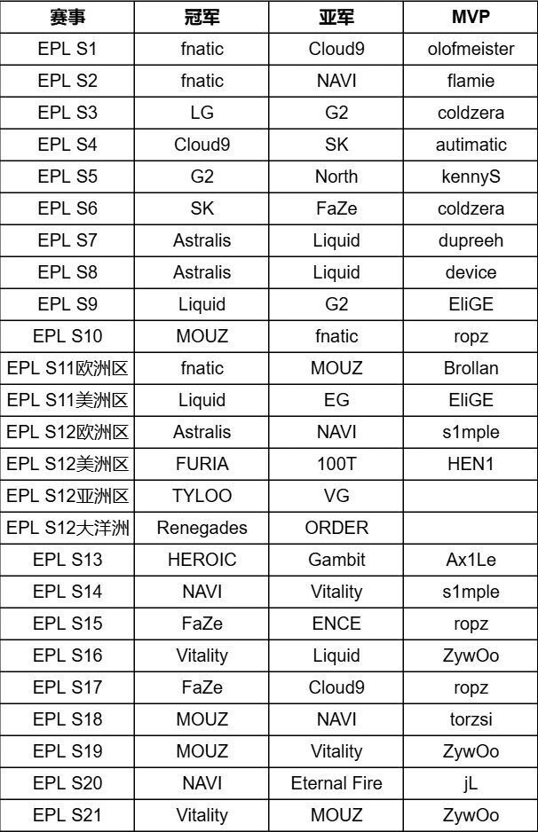 作为一个历史悠久的赛事,EPL已经来到了第22届,算上疫情期间线上举办的S11和S12,共出现过3个EPL三冠俱乐部: